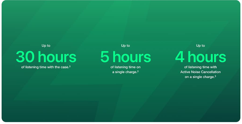 You can expect up to five hours of listening on a single charge and up to 30 hours total with the charging case.