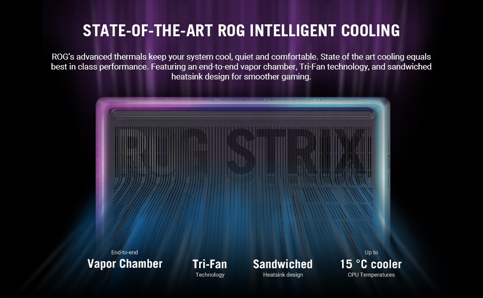 Packing this much power into a laptop chassis necessitates an equally impressive cooling solution, and ASUS has delivered what can only be described as a thermal masterpiece. The ROG Intelligent Cooling ecosystem in the Strix G16 is a marvel of engineering. It features an unprecedented three Arc Flow Fans that utilize a high blade count, designed to maximize airflow while reducing turbulent noise. Furthermore, the cooling array includes a full-width heatsink and dedicated heat pipes for both the CPU and GPU, ensuring heat is efficiently drawn away from the core components.